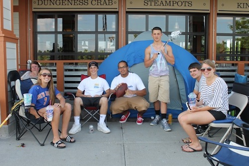 The Tysons were followed at 2:15 by a group of local teens who pitched a couple of tents and entertained themselves playing frisbee and hackeysack and tossing lacrosse balls back and forth in the parking lot. Alexa Bloss, Greg Trent, and Kevin O’Kula of Riverhead, along with Mark Andrejack, and Todd Brewer and Sam Lombardi of Jamesport, said they’d never been to a Joe’s Crab Shack but they heard about the giveaway and thought, “Why not?”