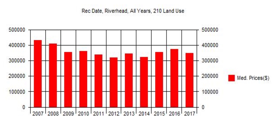 Second quarter sales in Riverhead Town topped $51 million, an increase of almost 19 percent over the second quarter of 2016, according to Suffolk Research Service. The median price of a single-family residence in Riverhead was $330,000 in the second quarter, when 130 single-family home sales closed. The median single-family home price in Riverhead, which has not yet returned to its pre-recession level of $432,500 in 2007, remains the lowest of the five East End towns.