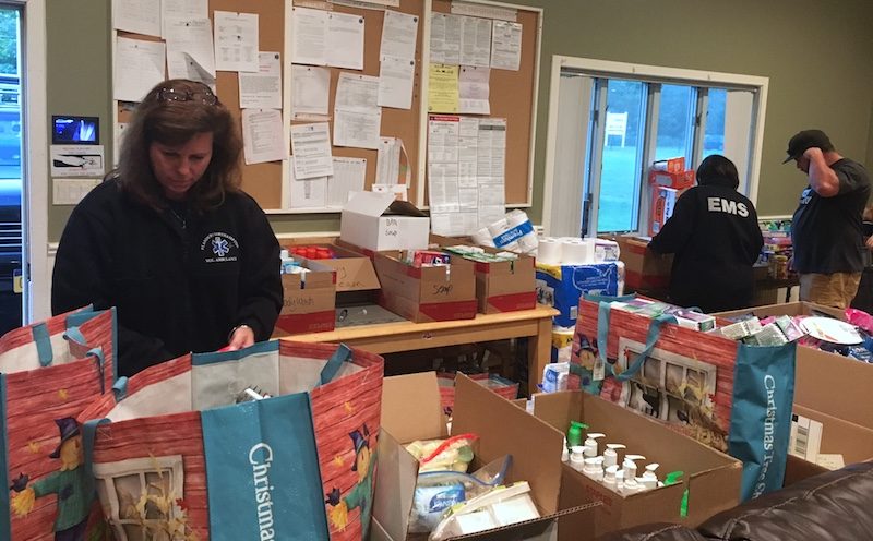 From wall to wall, the main room of Flanders-Northampton Ambulance Headquarters was filled last night with a sprawling variety of donations from the local community. Volunteers from the ambulance corps sifted through baby diapers, blankets and sheets, placemats, paper goods, soap, pillows, bath towels, pet food – sorting everything into labeled cardboard boxes that quickly piled up on every available surface.
