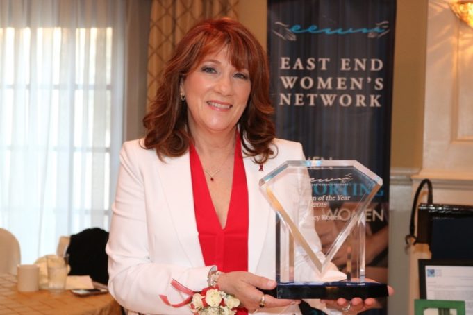 The East End Women’s Network woman of the year had the audience in stitches last night at the organization’s dinner in her honor at the Birchwood in Riverhead, telling stories like the one about teaching a strip-tease class to breast cancer survivors at a convent in Water Mill. Yes, that really happened — and she had a photo to prove it.