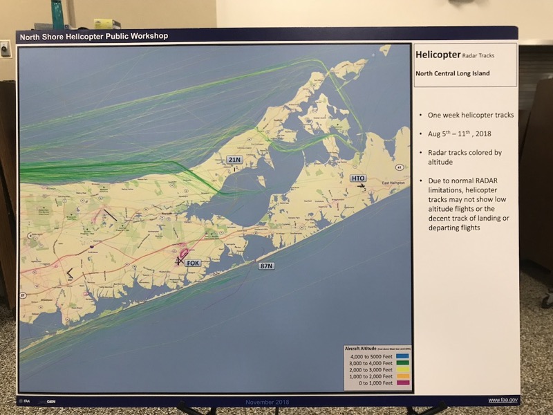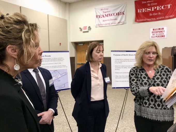 The forum — a “workshop” format where FAA representatives were available to speak with residents about the North Shore Helicopter Route — was one of three such events on Long Island this week. Maps and graphics were positioned around the perimeter of the Riverhead Middle School cafeteria and FAA representatives stood by to answer questions.