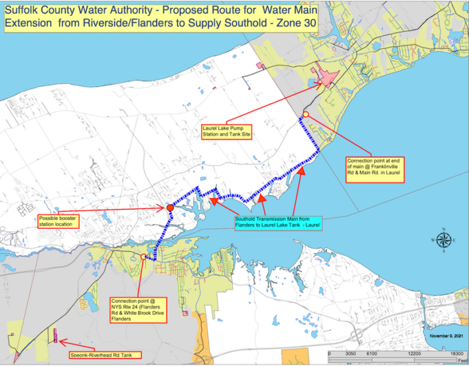 The pipeline will be installed along Flanders Road from White Brook Drive to Route 105, north on Route 105 to Indian Island County Park, through the park to Hubbard Avenue, east on Hubbard Avenue to Meeting House Creek Road to Peconic Bay Boulevard. Installation will continue the length of the boulevard to Laurel Lane, then north on Laurel Lane to Main Road and a connection point to a SCWA main at Franklinville Road in Laurel. The pipeline installation will require lane closures where work is underway.
