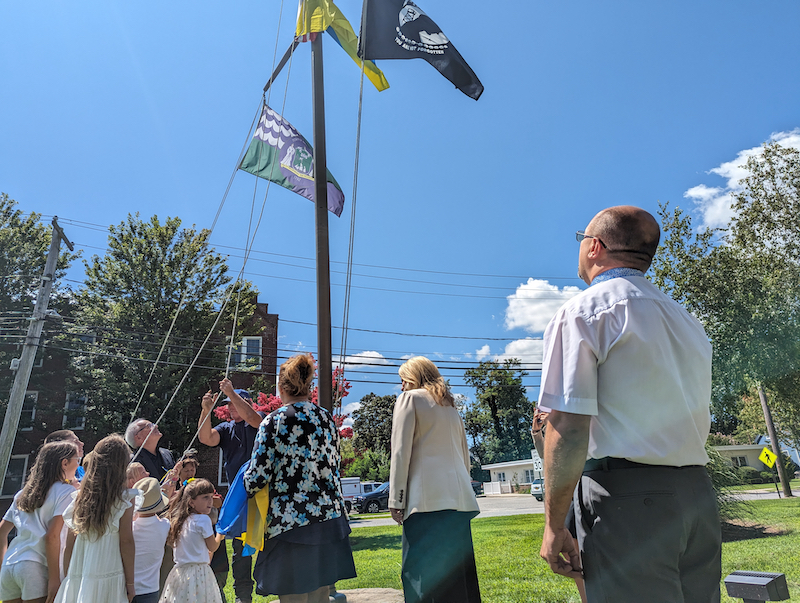 The flag-raising took place as the crowd sang the Ukrainian national anthem. Children were invited to help raise the flag up the pole.