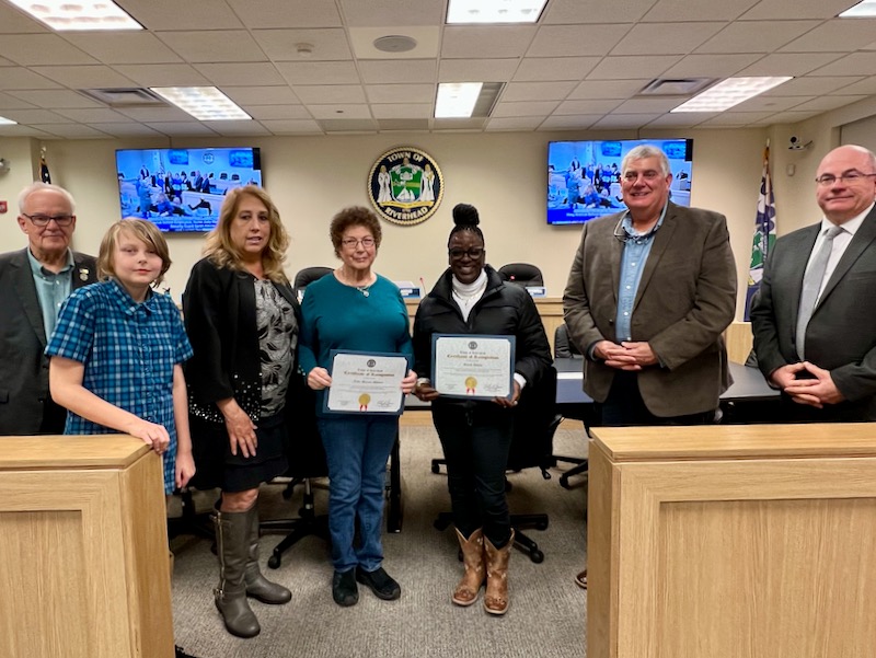 The Town Board on Thursday also presented Riley Avenue Elementary School nurse Judy Marcus-Shivers and security guard Sarah Atkins with certificates of appreciation for their actions that saved the life of a choking child at the school on May 9. On that day Marcus-Shivers and Atkins performed the Heimlich maneuver on a child who was choking on a chicken nugget.