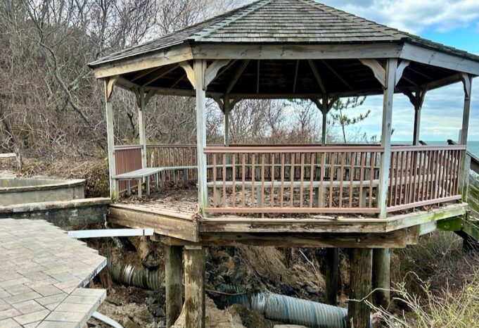 The gazebo itself is structurally sound because it’s built on 40-foot pilings, Testa said. “It looks scary because probably eight or 10 feet of the pilings are exposed,” he said, “but there’s still a good portion of them in the ground.”