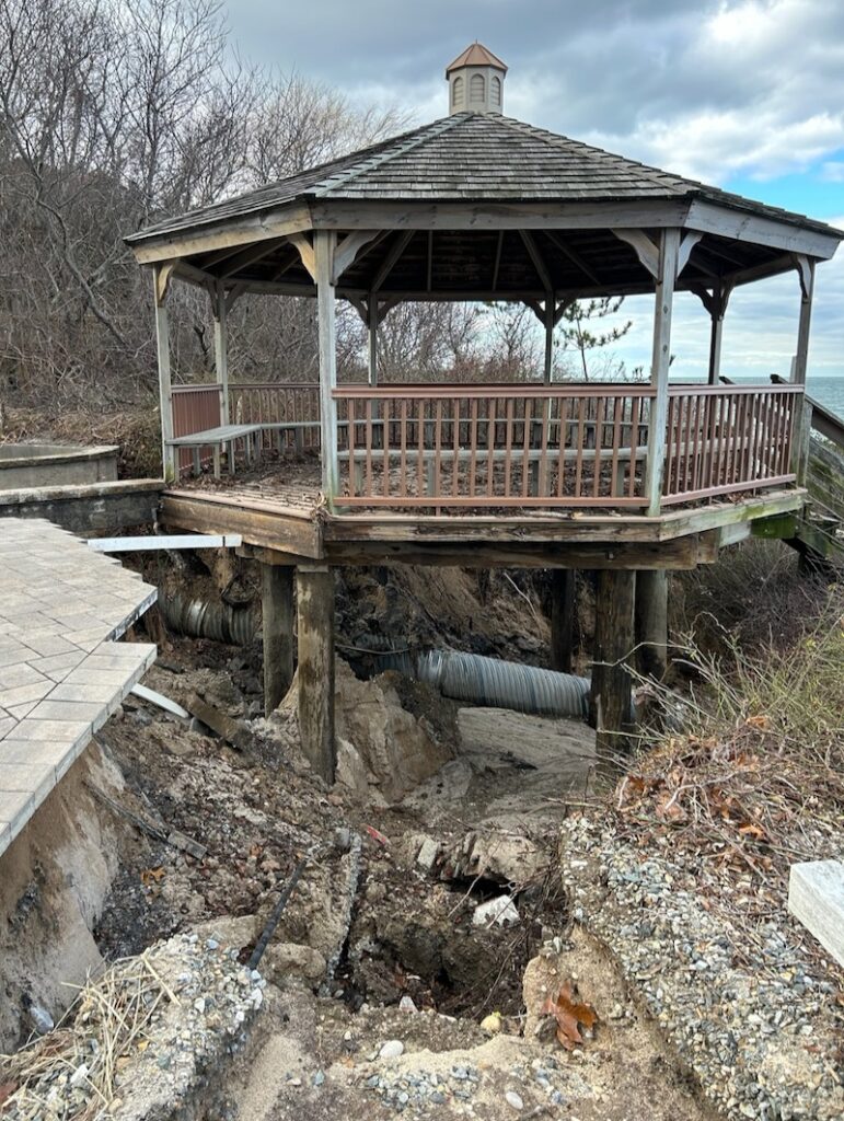 Rain during last week’s storm overwhelmed the drainage system along Park Road — an extensive system of leaching basins and stormwater inlet grates originally installed in the 1990s to prevent the washouts and erosion at the road-end beach that occurred during every major storm, Assistant Town Engineer Ken Testa said. When the system became overwhelmed last week, a large volume of fast-moving water rushed down Park Road to the beach parking lot, he said. The water flowed over the tall concrete curb there and down the front of the bluff, causing major erosion of the bluff seaward of the gazebo and resulting in the collapse of an area under and adjacent to the structure.