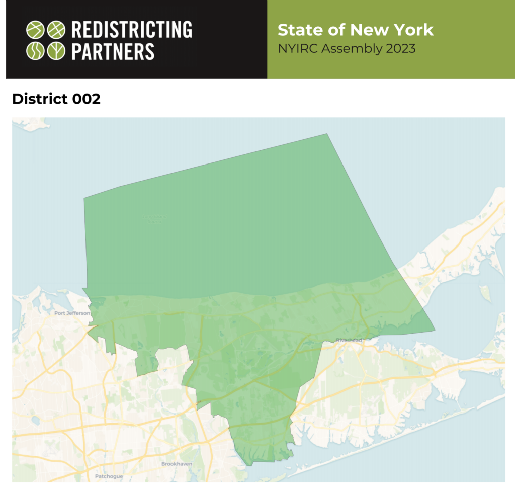The Second Assembly District map was revised last year by the New York Independent Redistricting Commission, and signed into law, after the map used for the 2022 election was ruled invalid following that election. (See map below.)