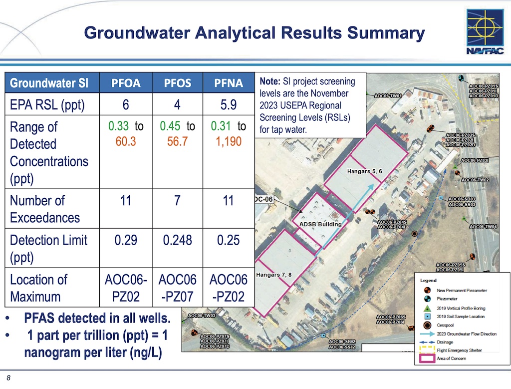 Esposito explained that request in a phone interview yesterday. The Navy has recently discussed testing offsite private wells with state and county officials, she said, and was “inexplicably” still talking about using the outdated 70 ppt lifetime advisory, which was superseded in 2022, as a standard.