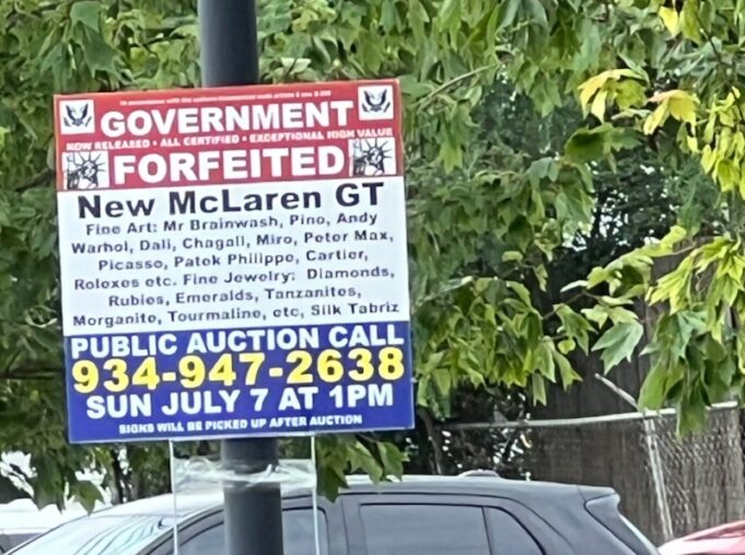 The signs advertise “government forfeited” items, including a luxury automobile, fine art and precious gems to sold at a public auction at an undisclosed location.