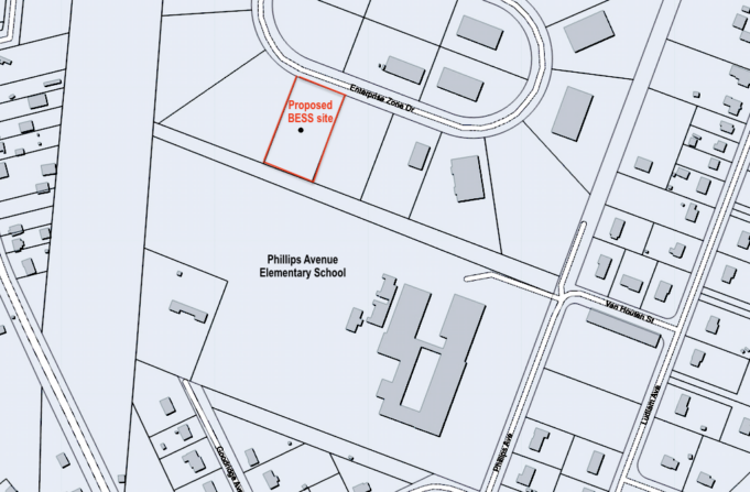 The building housing the batteries would be 460 feet from the Phillips Avenue Elementary School property line, along a field behind the school building itself.