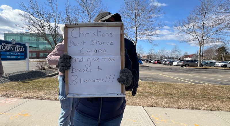 Protesters lining the sidewalk on Roanoke Avenue, along the Riverhead Town Hall parking lot, were buoyed by the frequent sound of car horns honking in support and the thumbs-up gestures of passing drivers and their passengers. A handful of other passing motorists made their feelings known with other hand gestures and a couple opened their windows to shout down the protesters as they passed.