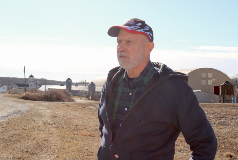 Doug Corwin looks out over the Aquebogue farmland his family has owned for generations. The land stretches south from Main Road as far as the eye can see. Farm buildings are scattered across the landscape.