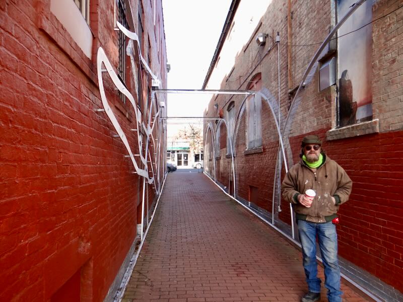 But others wondered if more people were going to walk through it. “It’s cool, but it’s not a huge change for downtown. It won’t impact a lot of people. Most of the people who come here are coming during the day, not at night” said barista Sunny Boudrea, working behind the counter at Mugs on Main. Coworker Ashley Quiambao was more upbeat. “The walkway was plain and it’s good that more art is coming to the community.”