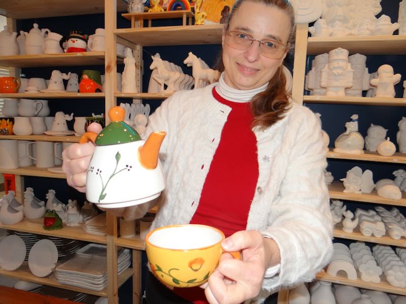 Entering the store at Long Island Crafty One, located near the ever-popular vintage carousel, visitors see the full array of ceramic mugs, bowls, vases, plates and figurines waiting to be painted. Owner Gabriela Schwender, who previously had a studio in Port Jefferson, said she opened up here at The Shoppes “because it’s unaffordable for families to drive up the island for things to do with their kids.” She loves to teach ceramic painting, flower arranging and home décor; her shop offers birthday parties, activities for private groups, after school programs, senior craft clubs and special classes for people on the spectrum who “are my regular customers.”