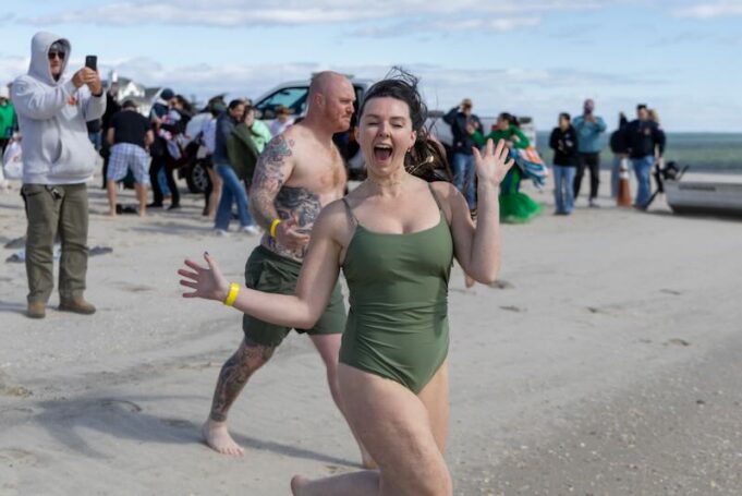 But those conditions didn’t deter dozens of hardy souls from stripping down to their swimsuits and charging into the icy water of the bay at noon yesterday for the Leprechaun Leap, a fundraiser to support the Jamesport St. Patrick’s Day Parade.