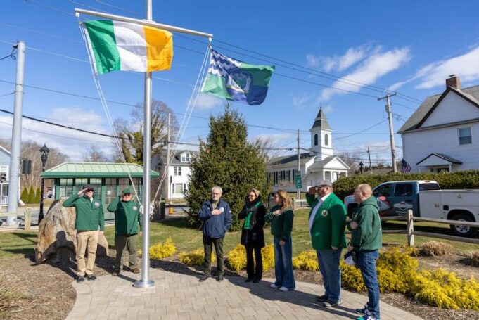 Town officials on Saturday morning joined the East End Emerald Society for the annual flag-raising tradition, begun in 2024.