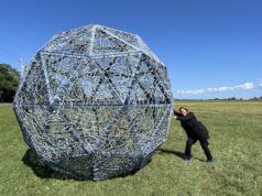 The 12-foot-tall sculpture, a metal sphere clad in denim, weighs roughly half a ton and is a part of a new art exhibit titled "Harvesting Memories in Blue," by Sherry Davis of Riverhead.
